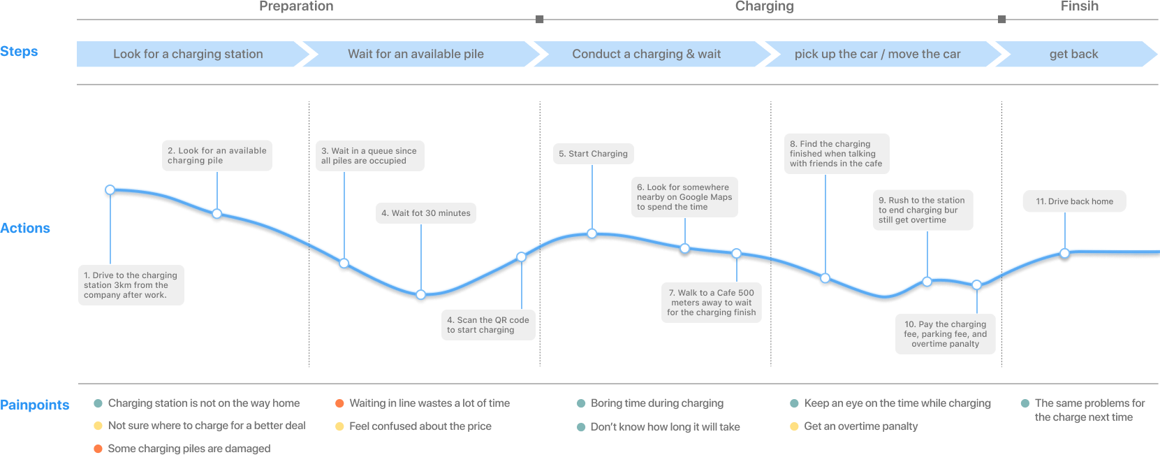To frame the challenge, we mapped the end-to-end journey of drivers who rely on public charging. This process revealed where frustrations accumulate and where design opportunities could improve the experience.